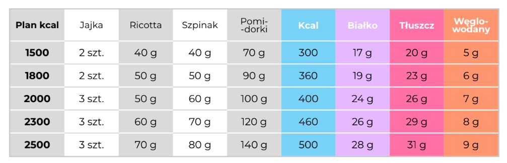 Przepis jest w pełni wegetariański, a dzięki ricotcie i jajkom zapewnia solidną dawkę białka. Danie jest lekkie, dostarcza około 300 kcal w porcji (przy 1500 kcal dziennie).