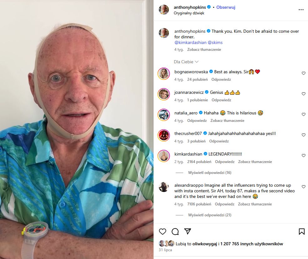 Świetnym przykładem jest viralowe wideo Anthony’ego Hopkinsa, który opublikował humorystyczny filmik. Założył w nim maskę Kim i wcielił się w rolę Hannibala Lectera — kultową postać z filmu „Milczenie owiec”. Hopkins stwierdził, że czuje się o 10 lat młodszy, a Kim Kardashian z entuzjazmem podzieliła się tym video na Instagramie
