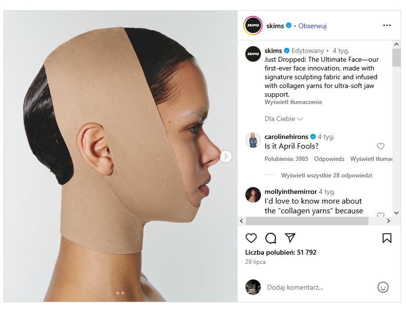 Marka odzieżowa Kim Kardashian promowała ten produkt jako „niezbędny element wieczornej rutyny pielęgnacyjnej”, który ma działać jak… bielizna modelująca, tylko dla twarzy. Kim Kardashian tłumaczyła na Instagramie: