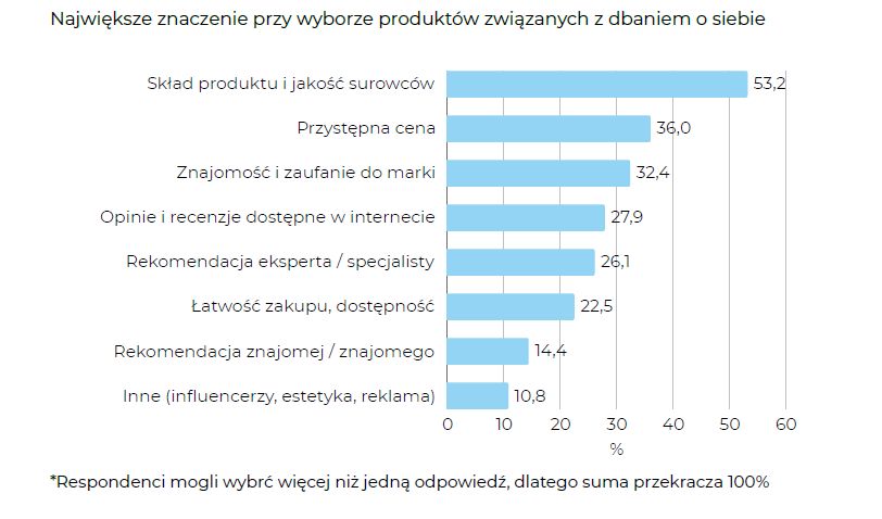 Jakim kluczem wybieramy kosmetyki? Najważniejszym czynnikiem jest skład produktu i jakość surowców — wskazało go 53,2% respondentów. To wyraźnie pokazuje, że konsumenci coraz bardziej zwracają uwagę na świadomą pielęgnację i analizują etykiety produktów.
