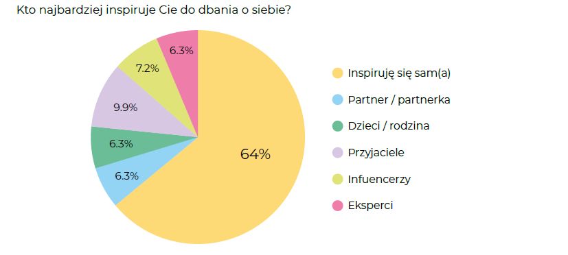 Najbardziej inspirujemy… samych siebie. Aż 64% osób deklaruje, że motywację do dbania o siebie czerpie z własnych potrzeb i przekonań. To bardzo silny sygnał zmiany — self-care przestaje być modą, a staje się osobistą odpowiedzialnością i nawykiem.