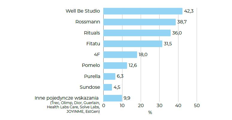 Wśród marek, które najbardziej kojarzą się z dbaniem o siebie, na pierwszym miejscu znalazło się Well Be Studio (42,3%). To ciekawe, bo pokazuje, że współczesny self-care nie ogranicza się już do pielęgnacji czy sportu — coraz częściej oznacza styl życia oparty na autentyczności, świadomości i równowadze.
