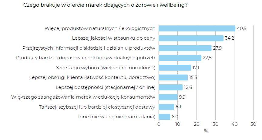 Kolejne ważne potrzeby to transparentność – jasne informacje o składzie i działaniu produktów (27,9%) oraz dopasowanie oferty do indywidualnych potrzeb (22,5%). Mniej istotne, ale nadal zauważalne: szerszy wybór (17,1%), lepsza obsługa klienta (15,3%) i większa dostępność (12,6%). Tylko nieliczni (ok. 7–9%) oczekują większego zaangażowania marek w edukację czy tańszych, szybszych dostaw.