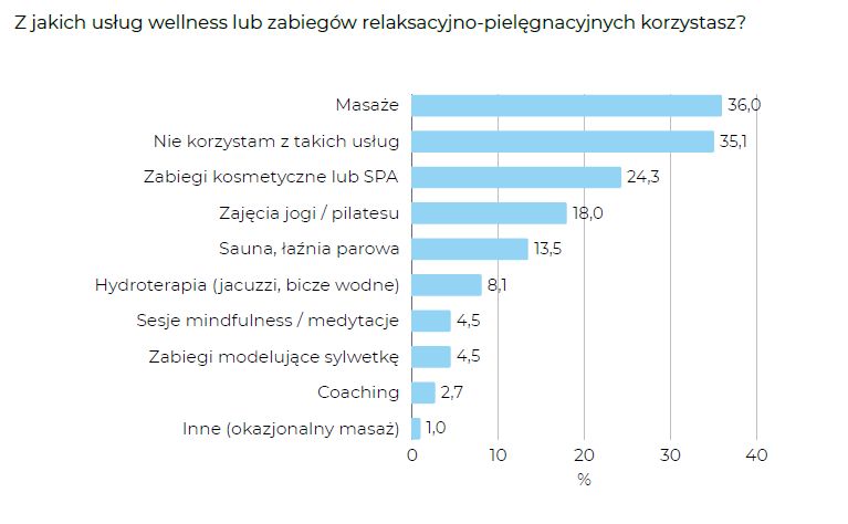 Najczęściej wybieraną formą relaksu są masaże (36%), co pokazuje, że Polacy najbardziej cenią fizyczne formy odprężenia. Zaraz za nimi — osoby, które w ogóle nie korzystają z takich usług (35,1%), czyli niemal co trzecia osoba nie angażuje się w żadne aktywności wellness. Na trzecim miejscu znalazły się zabiegi kosmetyczne lub SPA (24,3%), co potwierdza, że relaks często łączymy z pielęgnacją.
