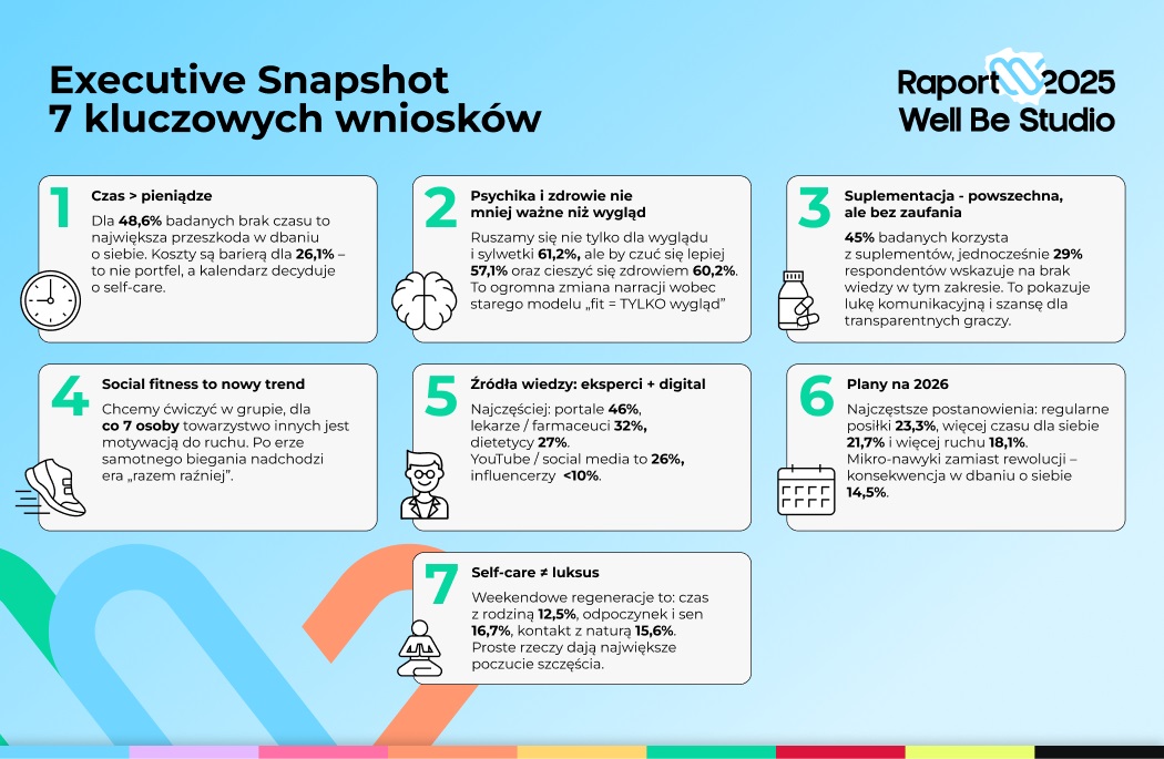 W najnowszym raporcie Well Be Studio Self-care 2025 – Jak Polacy dbają o zdrowie, wygląd i samopoczucie” przedstawiamy dane, liczby i insighty, które ilustrują prawdziwe podejście Polaków do self-care — gdzie napotykają bariery i czego naprawdę oczekują od marek.